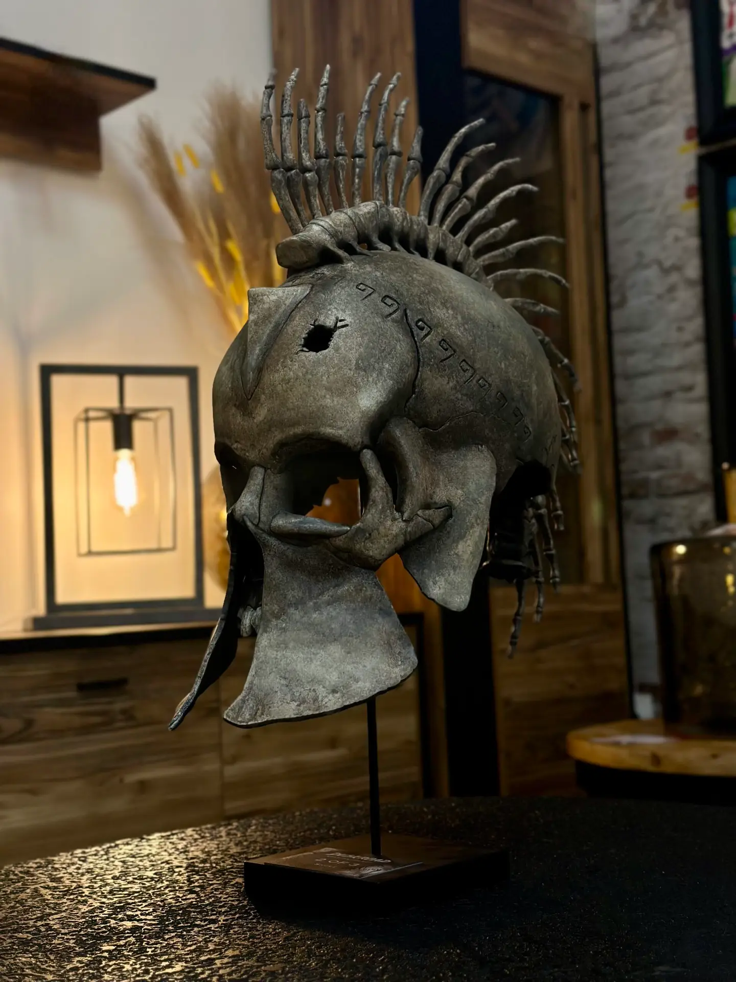 • Ce casque spartiate édition SKULL, datant de plusieurs siècles avant Jésus-Christ, raconte la chute tragique d’un soldat spartiate. Héros sur le champ de bataille, il devint un paria marqué par la folie et la violence. Créé à partir des os de ses victimes, ce casque, restauré en 2023, incarne la rencontre entre une histoire sombre et l’art contemporain, avec une précision minutieuse.